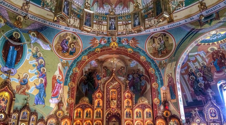 Icons cover the walls, ceiling, and iconostasis. In Orthodox theology, an icon is a window into heaven a sacred image through which believers venerate the holy persons depicted. When an Orthodox Christian kisses an icon or bows before it, they are venerating the person depicted, not the physical object itself.